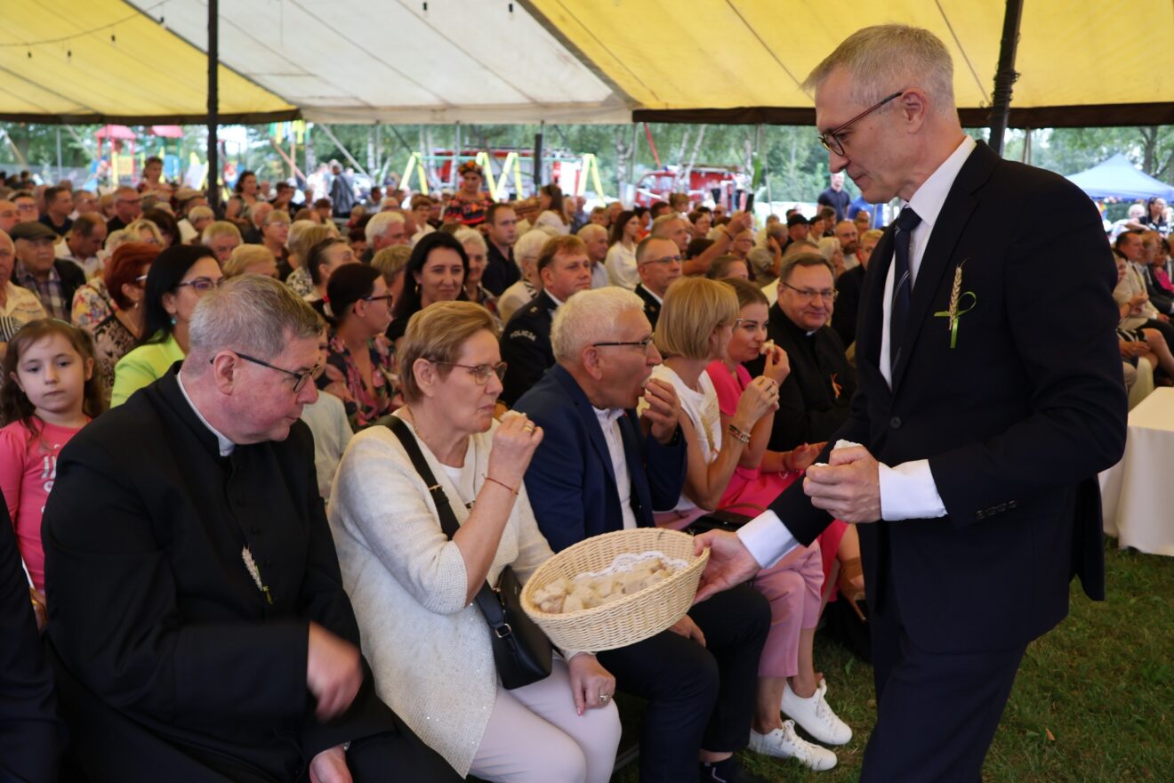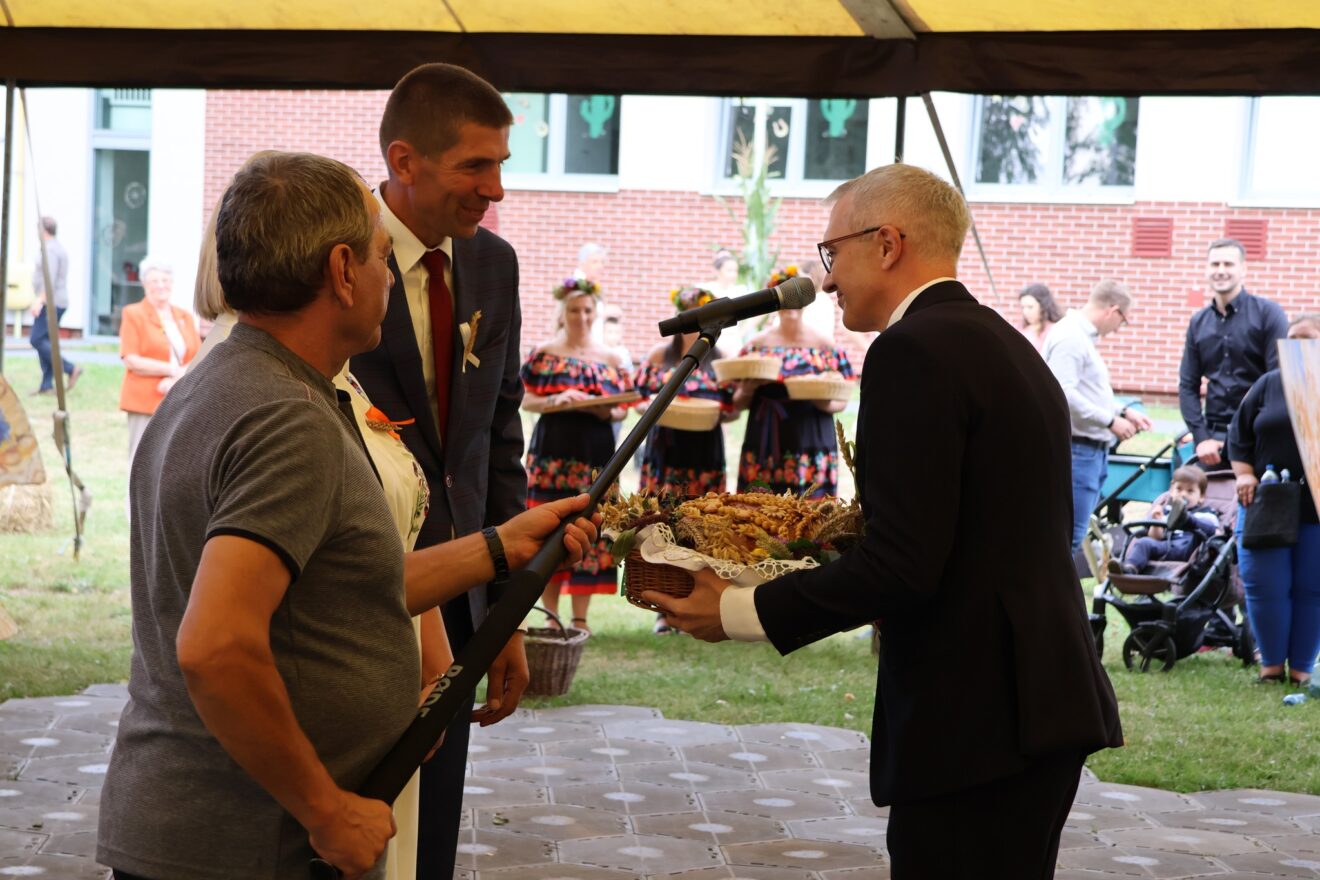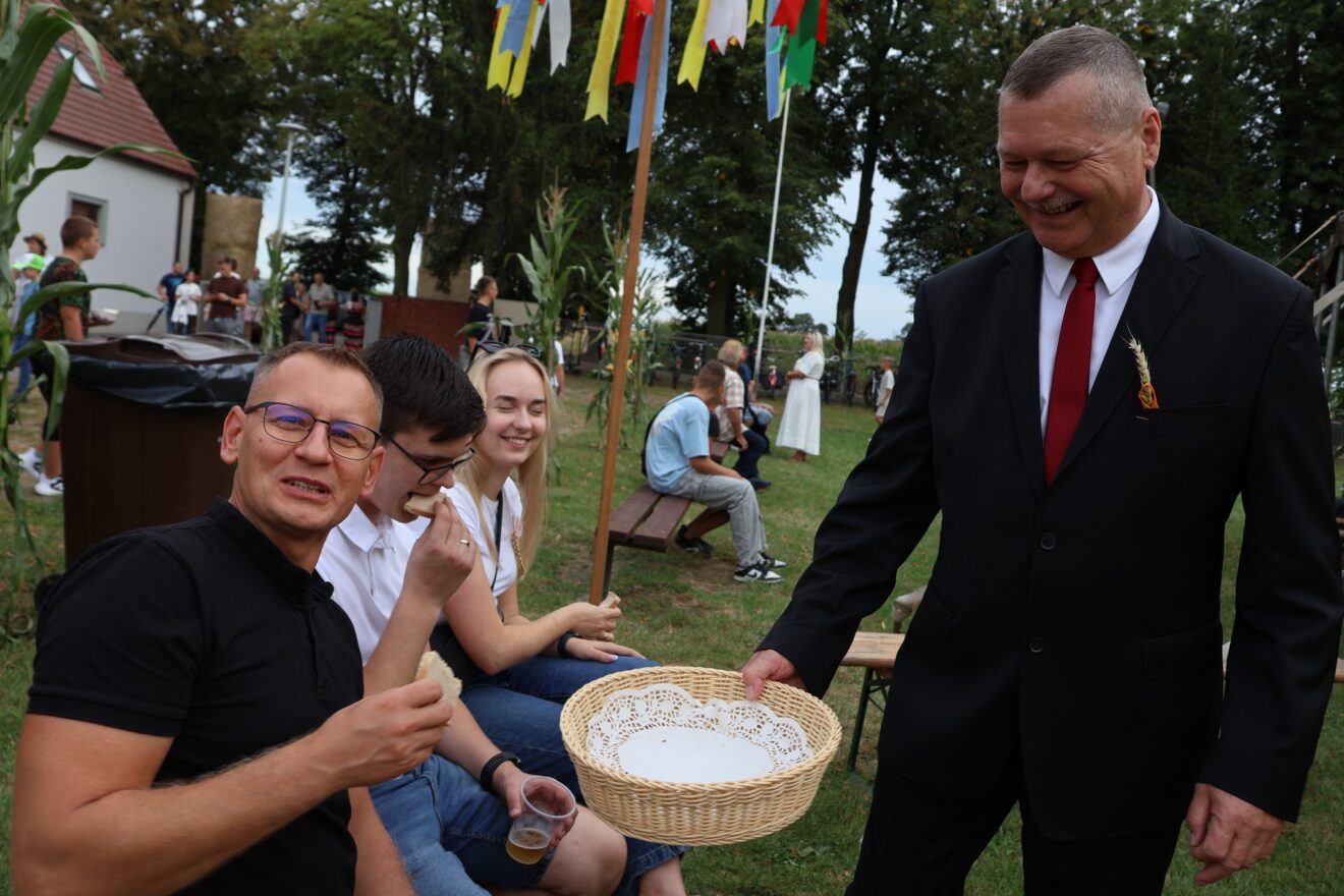 Bardzo dużą wagę podczas dożynek przywiązuje się do przekazania wieńca i chleba – wypiekanego z zebranych w danym roku ziaren. Tutaj nie mogło być inaczej. Wieniec na ręce Przewodniczącego Rady Miejskiej w Pleszewie przekazali asystenci starostów dożynek – Magdalena Antczak i Grzegorz Osuch. Chleb natomiast odebrał burmistrz Arkadiusz Ptak z rąk starostów – Ewy i Tomasza Osuchów. Dziękuję za chleb. W dwóch wymiarach. Pierwszy to ten najbardziej oczywisty. Chleb, którym żywimy się na co dzień. Stojąc przy sklepowej spółce rzadko kiedy zastanawiamy się skąd on się tam wziął. Dzisiaj mówimy właśnie o samym początku, o ciężkiej pracy rolnika. Powinniśmy każdego dnia dziękować wszystkim, dzięki którym chleb po prostu jest. Chleb to również symbol życia, współpracy i zgody. To widać w takich chwilach jak ta dzisiejsza, gdy miejscowość wspaniale przygotowała tę uroczystość. Bez takiej wspólnoty nawet najlepsze pomysły nie zostaną zrealizowane – podkreślał burmistrz Arkadiusz Ptak podczas uroczystości.