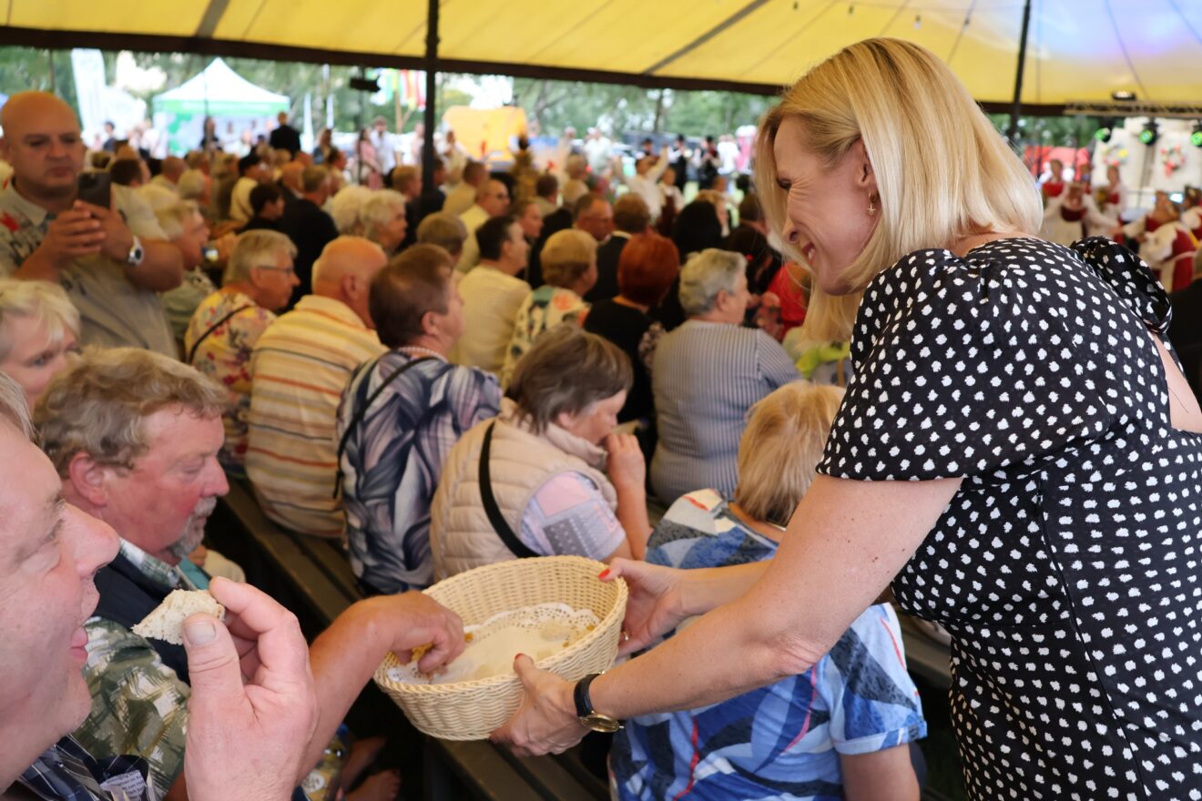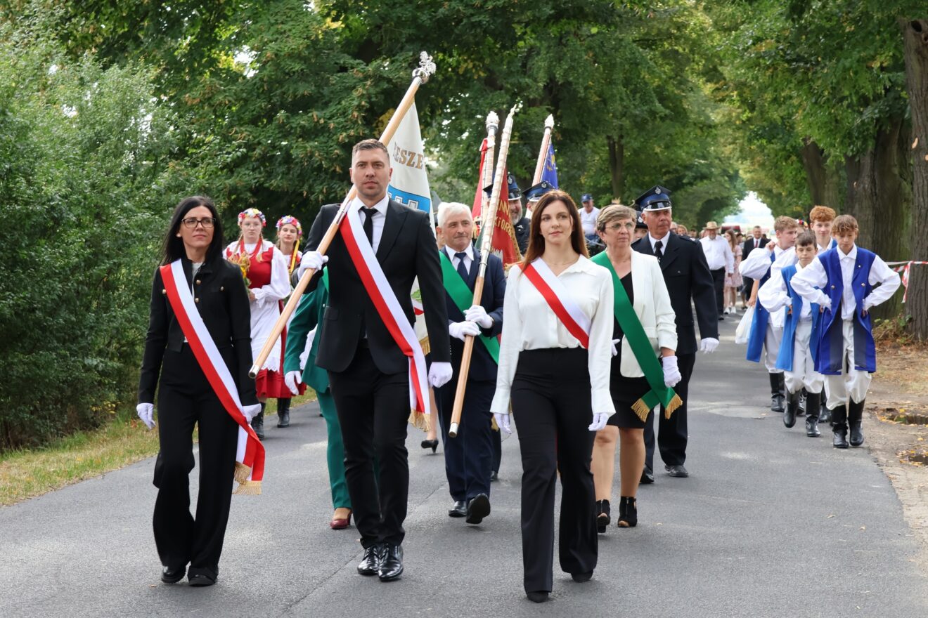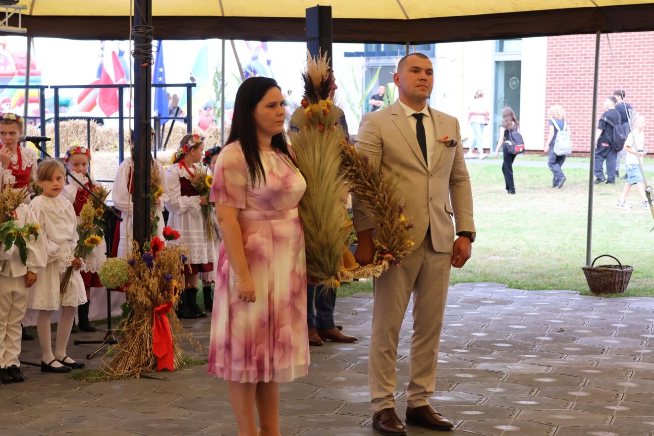 Bardzo dużą wagę podczas dożynek przywiązuje się do przekazania wieńca i chleba – wypiekanego z zebranych w danym roku ziaren. Tutaj nie mogło być inaczej. Wieniec na ręce Przewodniczącego Rady Miejskiej w Pleszewie przekazali asystenci starostów dożynek – Magdalena Antczak i Grzegorz Osuch. Chleb natomiast odebrał burmistrz Arkadiusz Ptak z rąk starostów – Ewy i Tomasza Osuchów. Dziękuję za chleb. W dwóch wymiarach. Pierwszy to ten najbardziej oczywisty. Chleb, którym żywimy się na co dzień. Stojąc przy sklepowej spółce rzadko kiedy zastanawiamy się skąd on się tam wziął. Dzisiaj mówimy właśnie o samym początku, o ciężkiej pracy rolnika. Powinniśmy każdego dnia dziękować wszystkim, dzięki którym chleb po prostu jest. Chleb to również symbol życia, współpracy i zgody. To widać w takich chwilach jak ta dzisiejsza, gdy miejscowość wspaniale przygotowała tę uroczystość. Bez takiej wspólnoty nawet najlepsze pomysły nie zostaną zrealizowane – podkreślał burmistrz Arkadiusz Ptak podczas uroczystości.