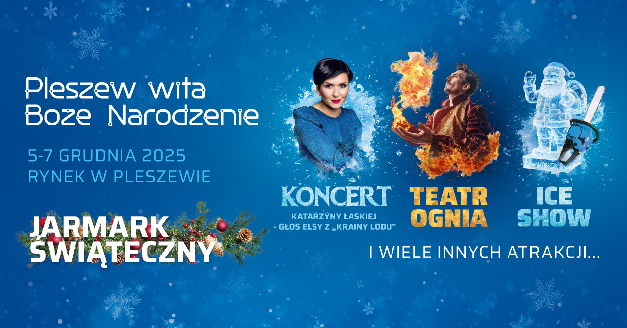Sobota na pleszewskim Rynku upłynie pod znakiem baśni i ognia. Na ulicach miasta pojawi się Bajkowy Orszak Królowej Śniegu – wraz z konkursem na najpiękniejsze świąteczne przebranie, co z pewnością doda wydarzeniu jeszcze więcej kolorów i kreatywności. Po zapadnięciu zmroku publiczność zachwyci Teatr Ognia, tworząc zimową opowieść pełną efektów i emocji, która co roku przyciąga tłumy.