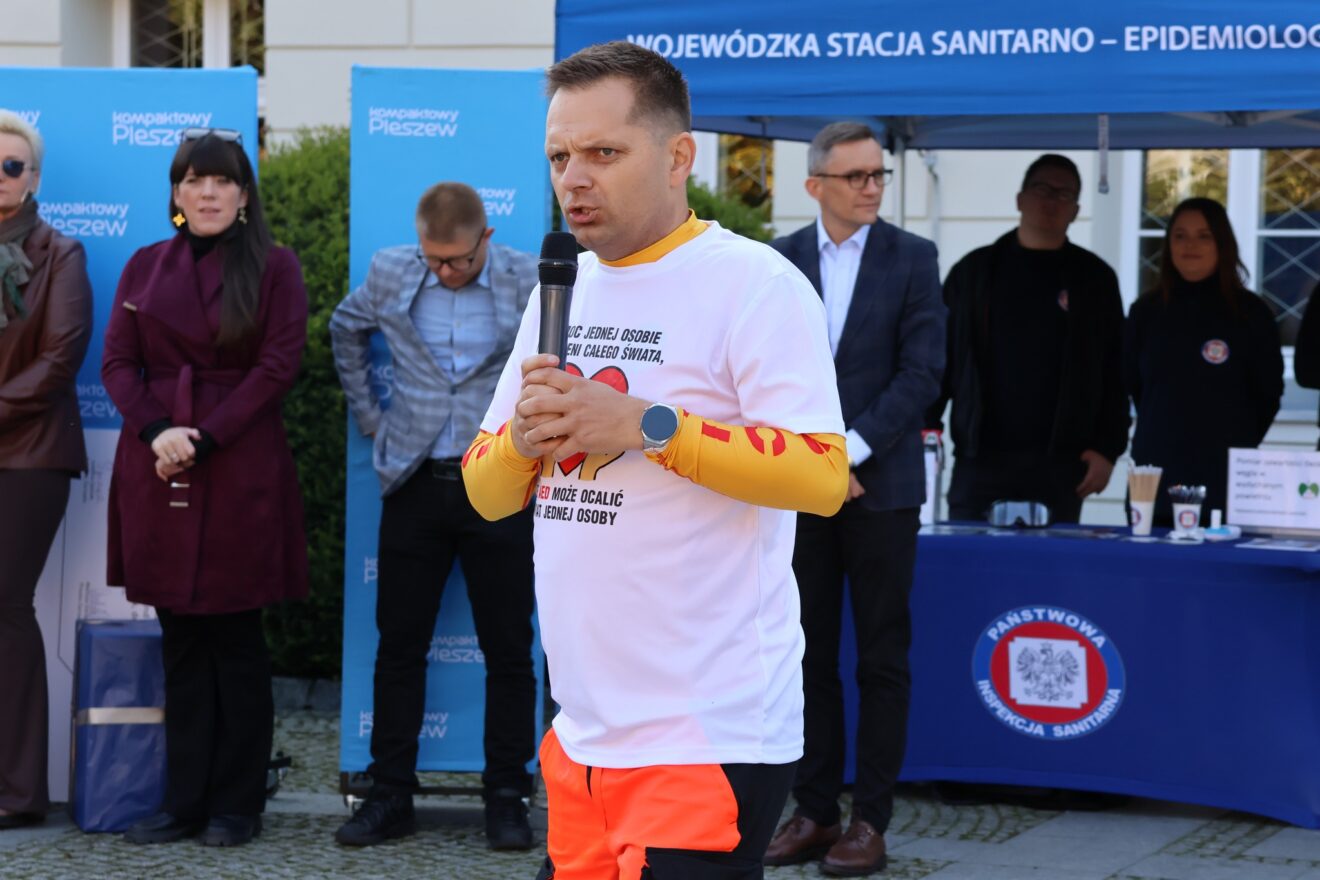 Cieszę się, że kolejny raz spotykamy się w ogromnym gronie osób, by ćwiczyć te ważne umiejętności. Myślę, że za rok rozszerzymy formułę choćby o elementy obrony cywilnej i przećwiczymy wiele innych, równie ważnych elementów – mówił Arkadiusz Ptak, burmistrz Pleszewa rozpoczynając akcję. Krótkie szkolenie niezmiennie przeprowadził „sprawca zamieszania” Dominik Kołaski, który pokazał w towarzystwie asystentki, jak prawidłowo udzielać pomocy przy użyciu defibrylatora AED. Punktualnie o godzinie 12:00 wszyscy zebrani na Rynku, jak również przedszkolaki i uczniowie w swoich placówkach rozpoczęli półgodzinną resuscytację krążeniową. Najmłodsi na misiach, starsi na fantomach. Na koniec nie zabrakło braw oraz sygnałów dźwiękowych dla wszystkich zaangażowanych – zarówno dla ćwiczących, jak i organizatorów.